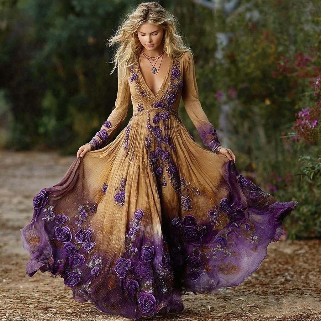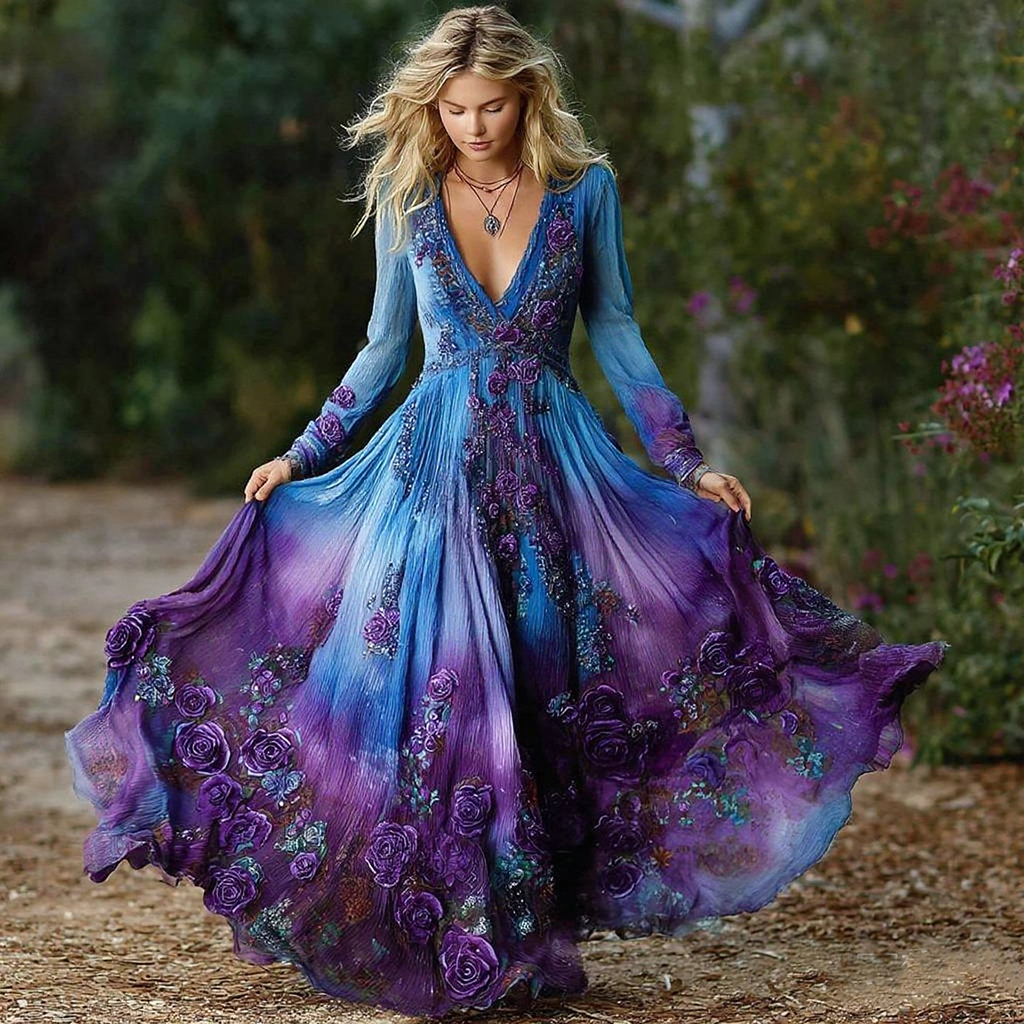 Women's Vintage Floral Embroidery Gradient Pattern V-neck Maxi Dress
