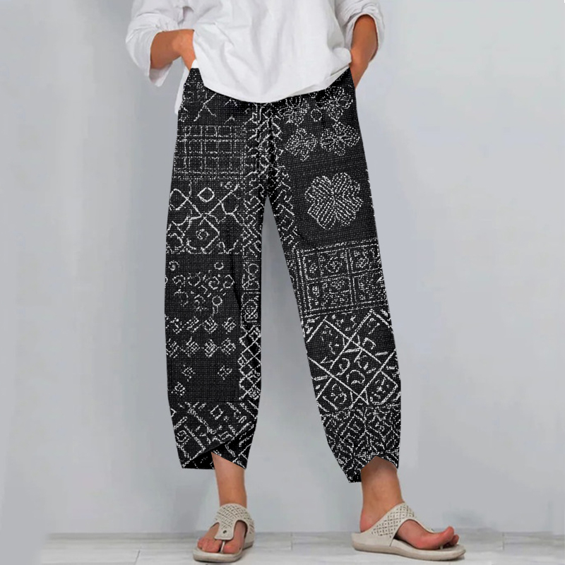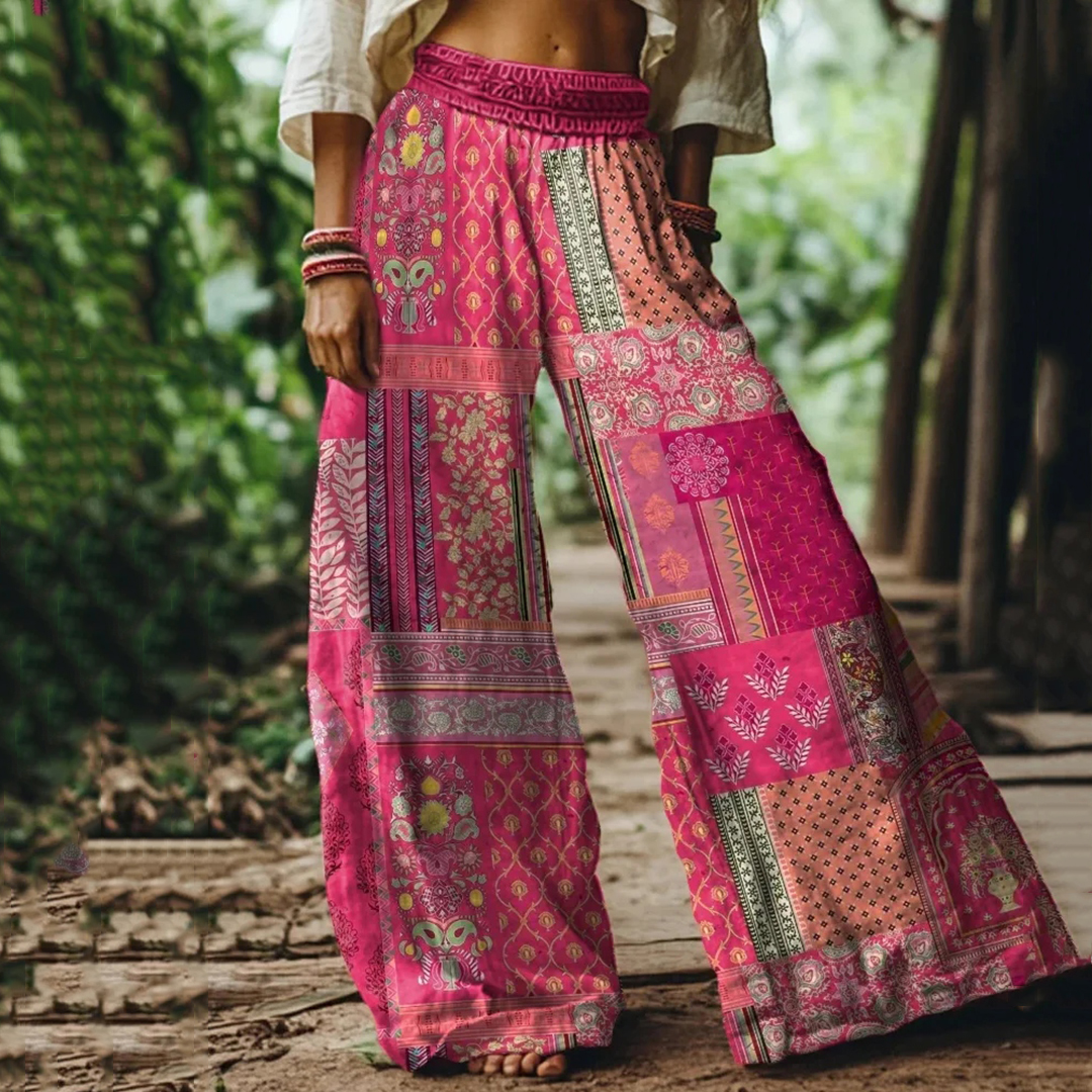 Boho Floral Patchwork Pattern Vintage Women's Linen Trousers