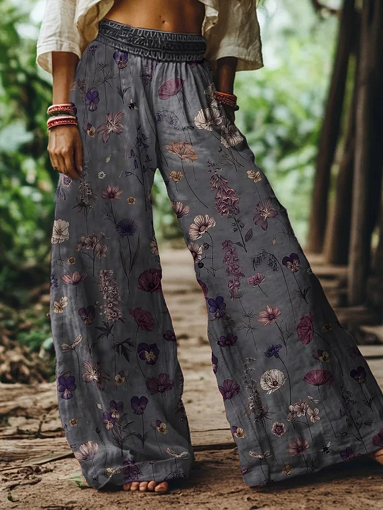 Women's Retro Linen Boho Flowers Art Long Loose Wide-leg Trouser Pants