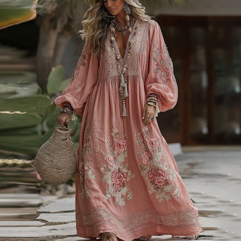 Vintage Boho Roses Embroidered V Neck Maxi Dress