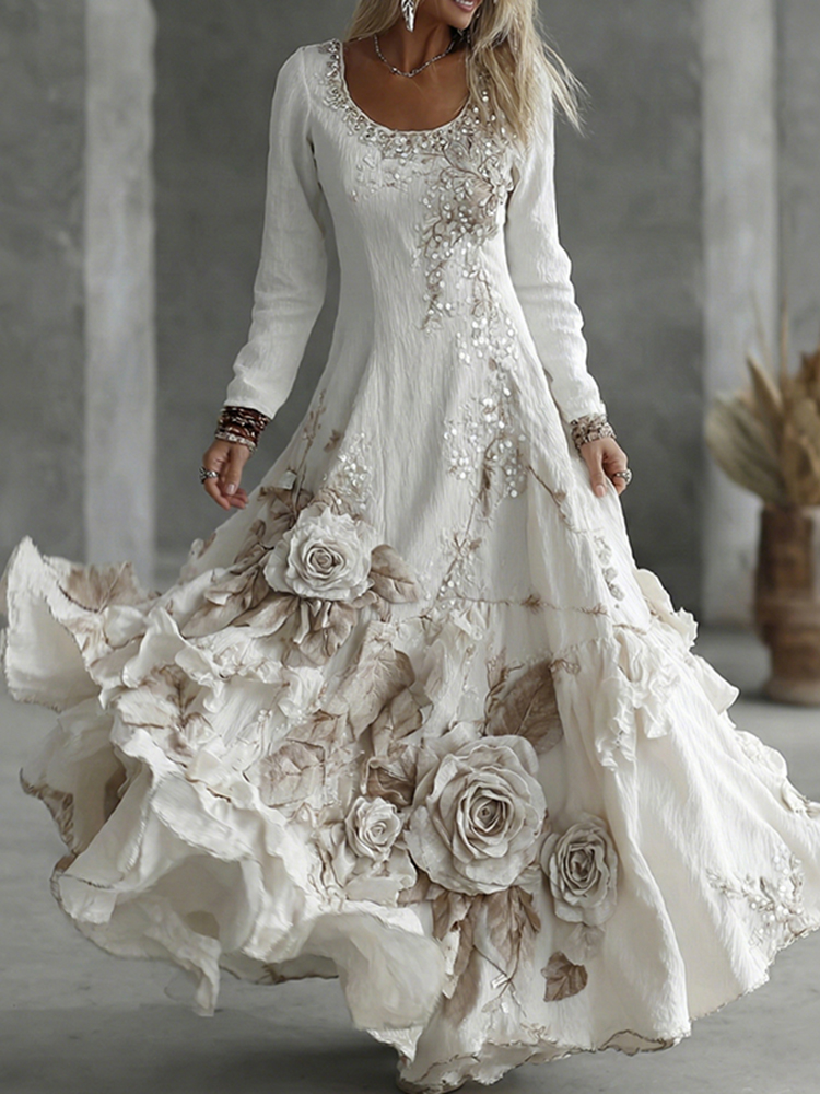 Women's Vintage Bohemian Floral Patchwork Round Neck Long Dress