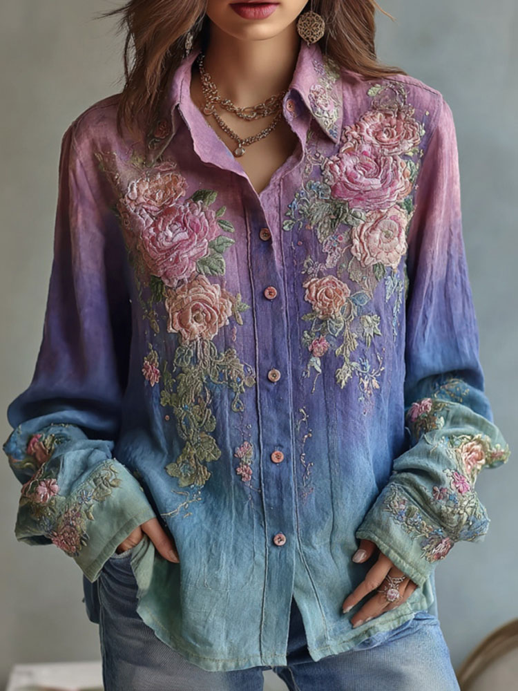 Bohemian Retro Plant And Flower Pattern Casual Cotton And Linen Long-sleeve Top