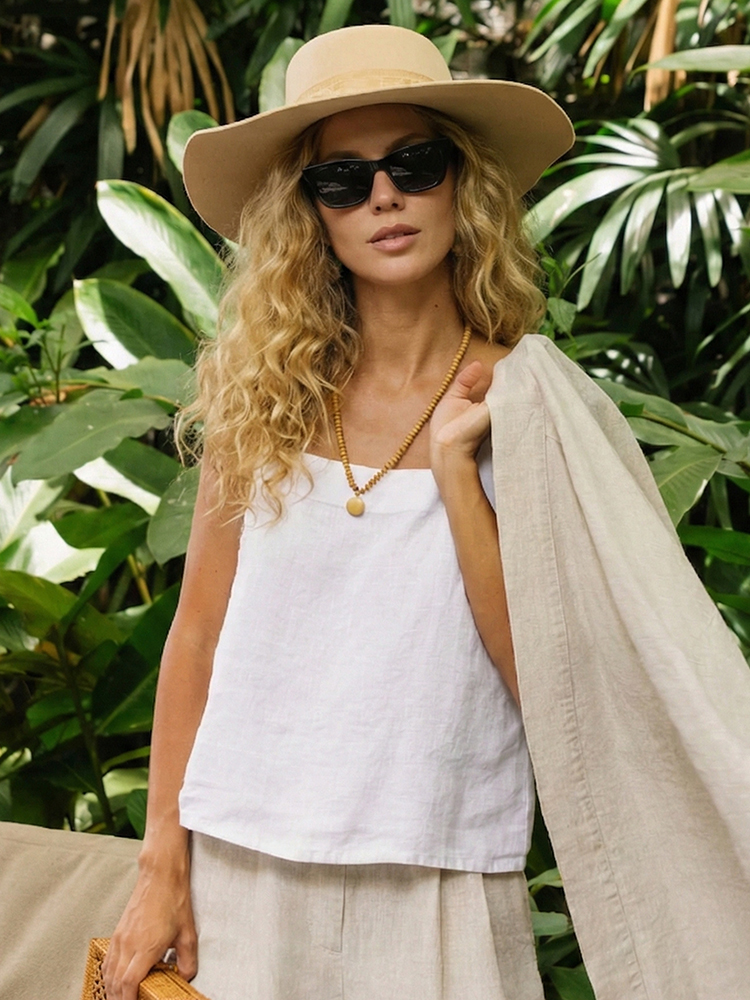 Women's Boho Linen Sleeveless White Linen Crop Top With Square Neck Tank Top