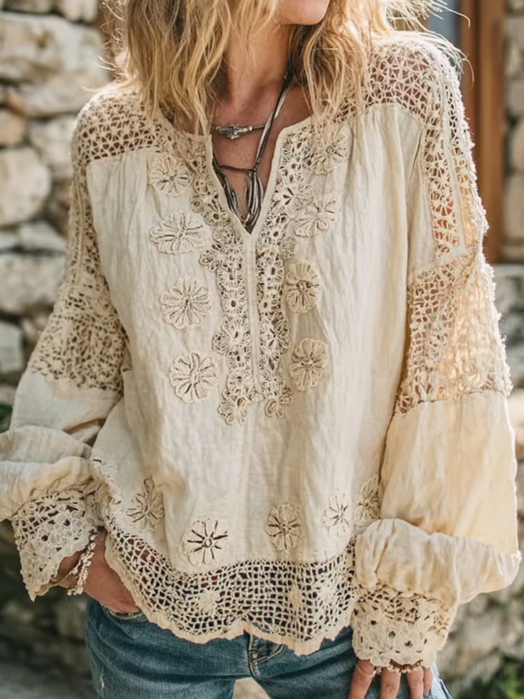 Women's Vintage Floral Lace Embroidery Art V-neck Shirt