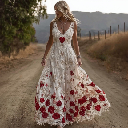 Valentine's Day Hearts & Flowers Embroidered Lace Linen Maxi Dress