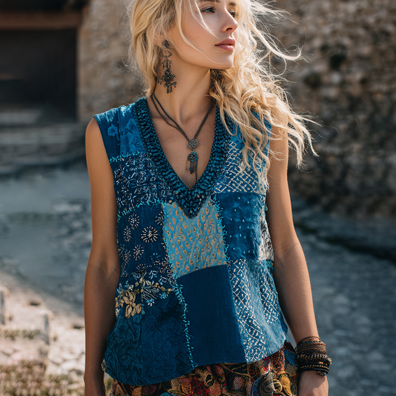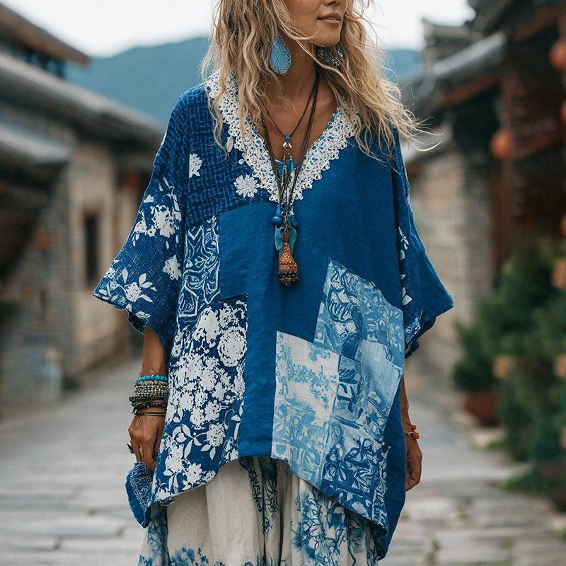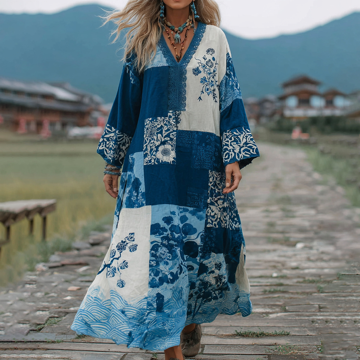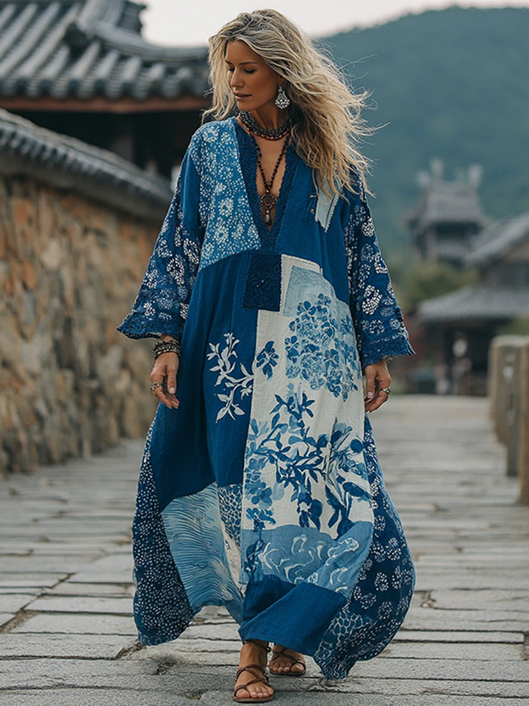 Women's Japanese Traditional Sashiko Art V-neck Kaftan