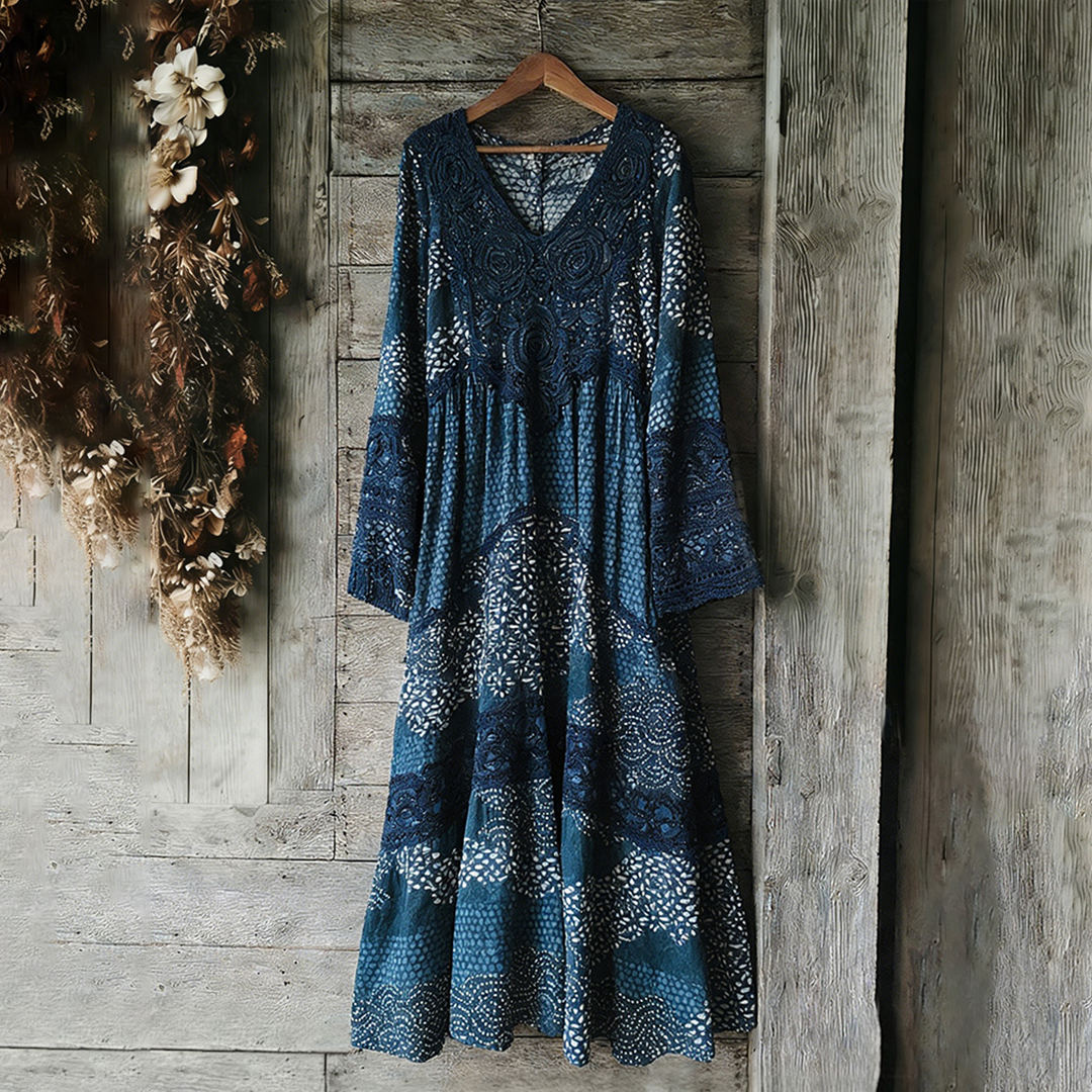 Vintage Japanese Traditional Sashiko With Lace Art Pattern Linen Blend Maxi Dress