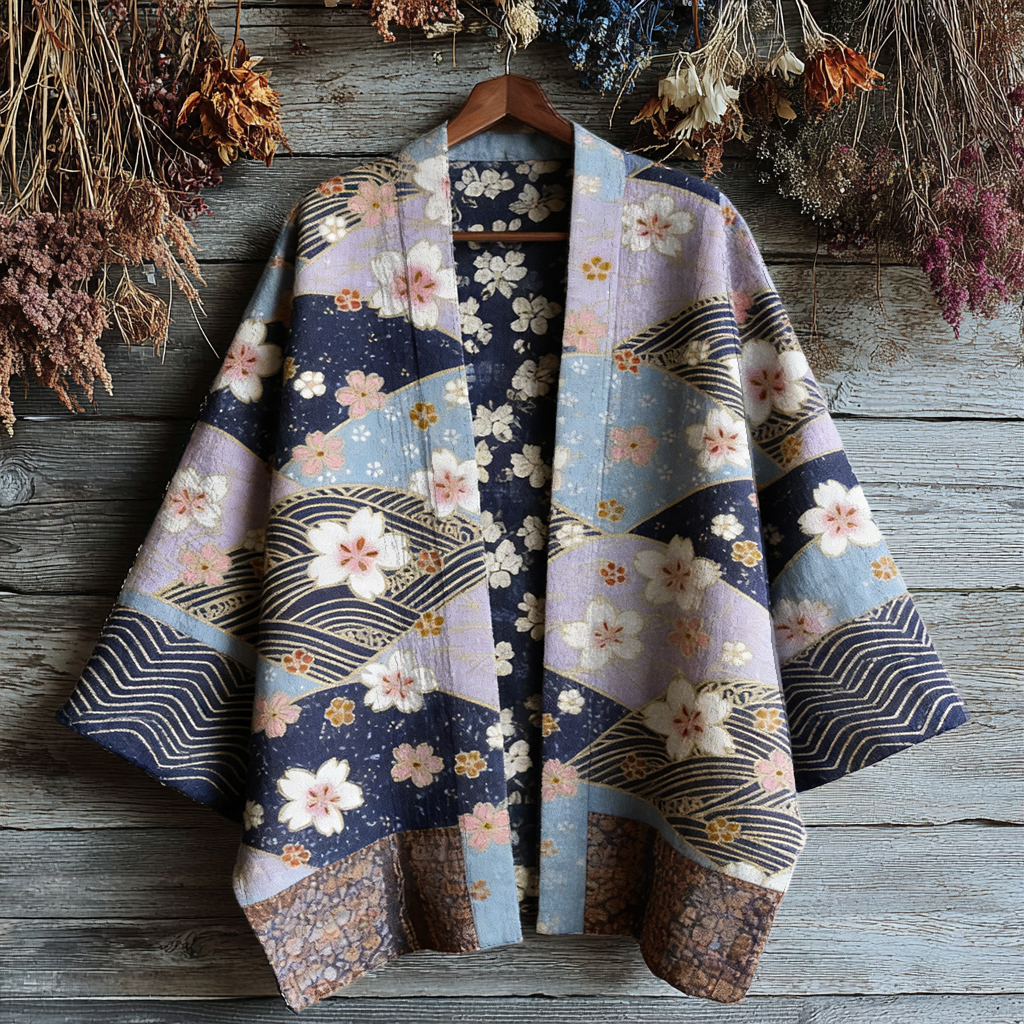 Retro Japanese Floral Traditional Sashiko Art Print Cotton And Linen Blend Kimono Cardigan