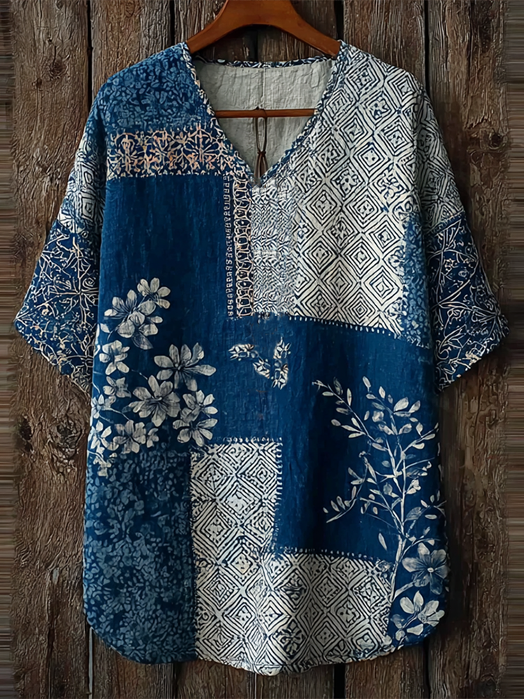 Japanese Art Retro Geometric Patchwork Plant Flower Print Women's V-neck Cotton And Linen Top