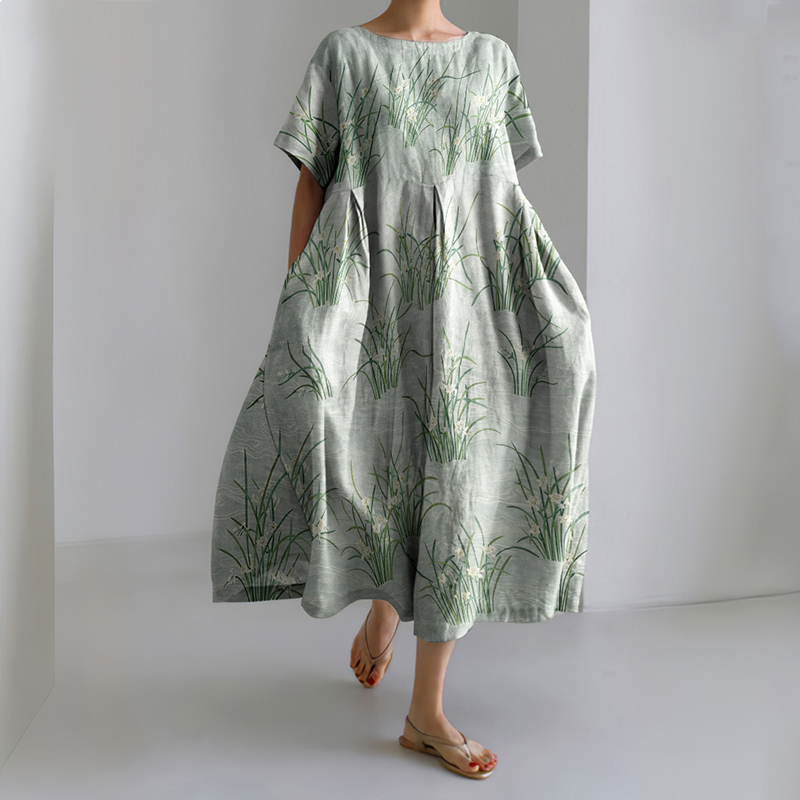 Japanese Art Retro Style Plant And Flower Pattern Patchwork Design V-neck Cotton And Linen Dress
