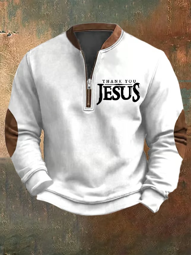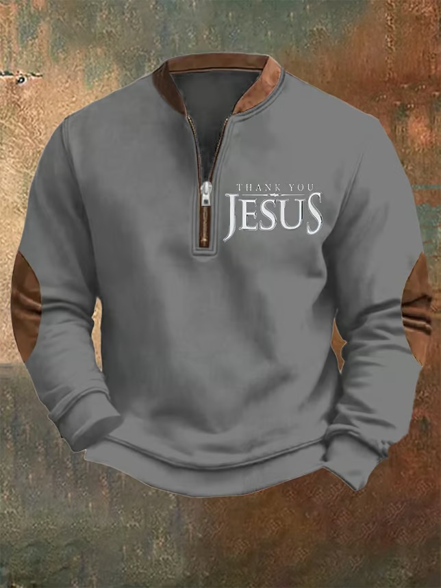 Men's Vintage Faith Thank You Jesus Printed Casual Zipper Sweatshirt