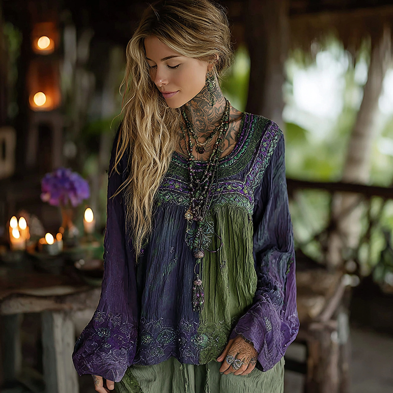 Women's Vintage Floral Embroidered Art V Neck Loose Blouses