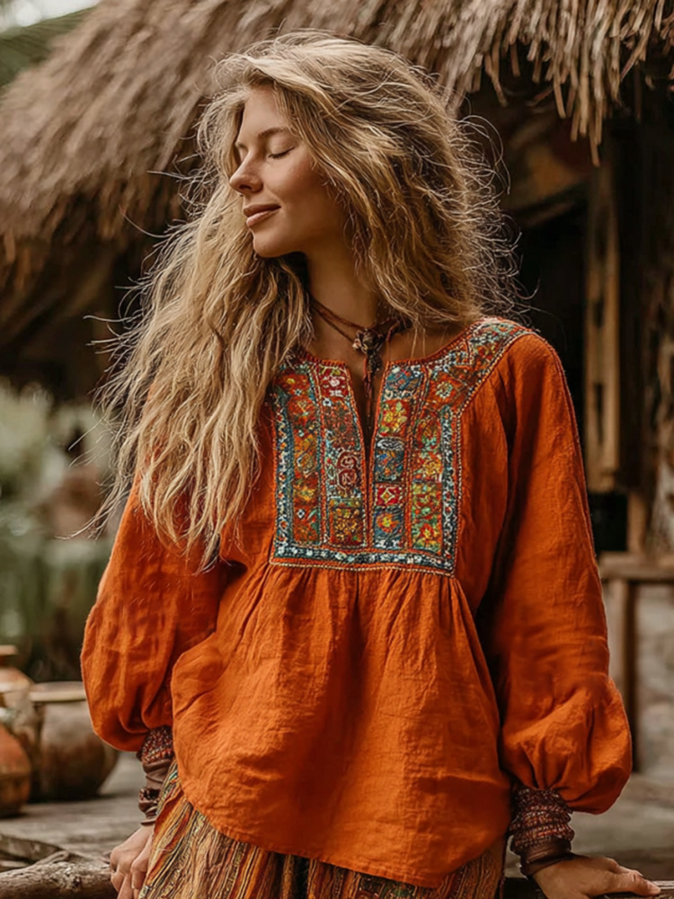Women's Retro Ethnic Floral Pattern Linen V-neck Shirt