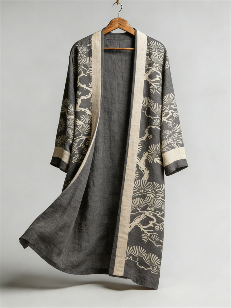 Japanese Pine Trees Lino Pattern Flowy Linen Long Kimono