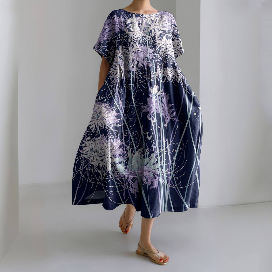 Women's Japanese Chrysanthemum Art Short Sleeve Midi Dress