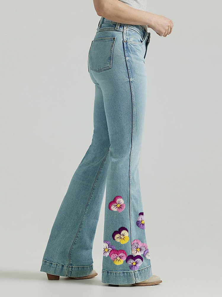 Cottage Floral Embroidered Lace Hem Patchwork Bell Bottom Jeans