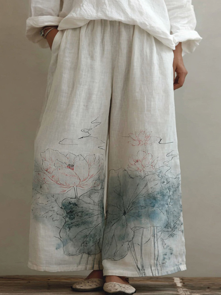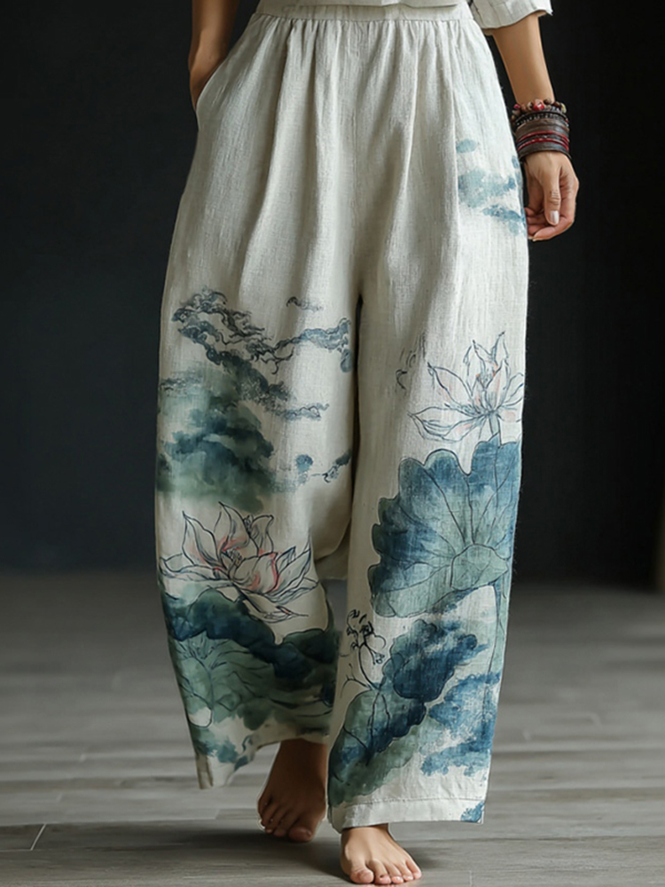 Women's Japanese-style Lotus Pattern Linen Trousers