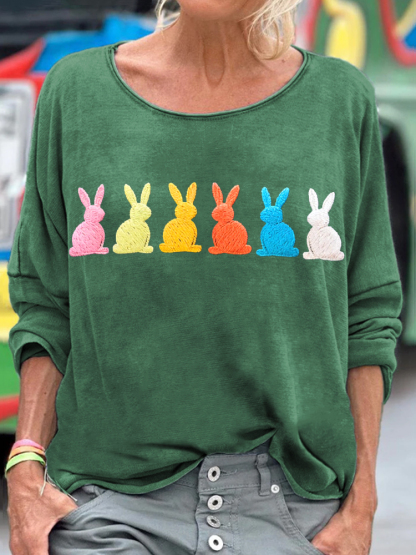 Women's Colorful Bunny Embroidered Long Sleeve T-shirt