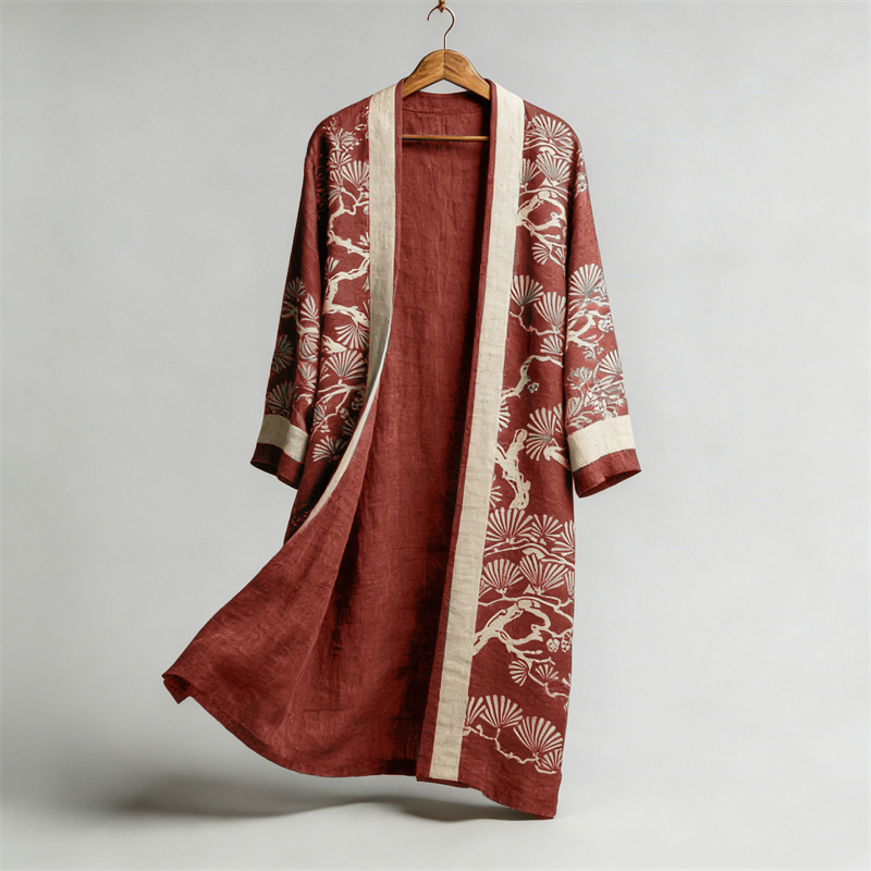 Japanese Pine Trees Lino Pattern Flowy Linen Long Kimono