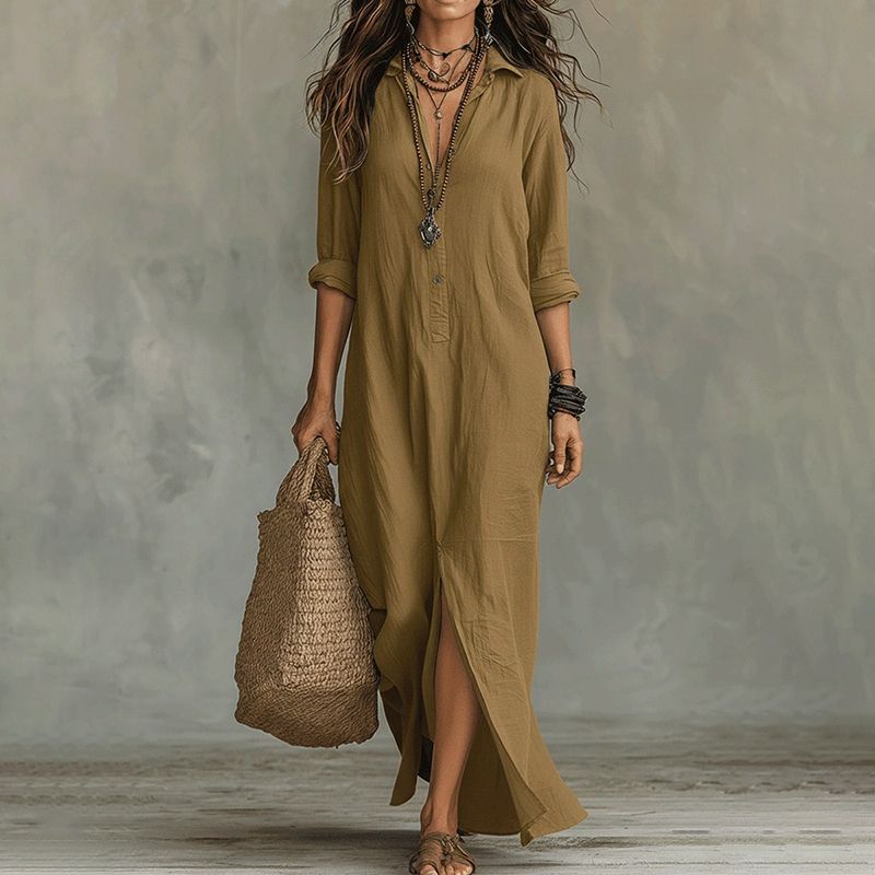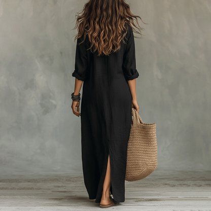 Women's Casual Solid Color Collared Front-slit Cotton Linen Maxi Dress