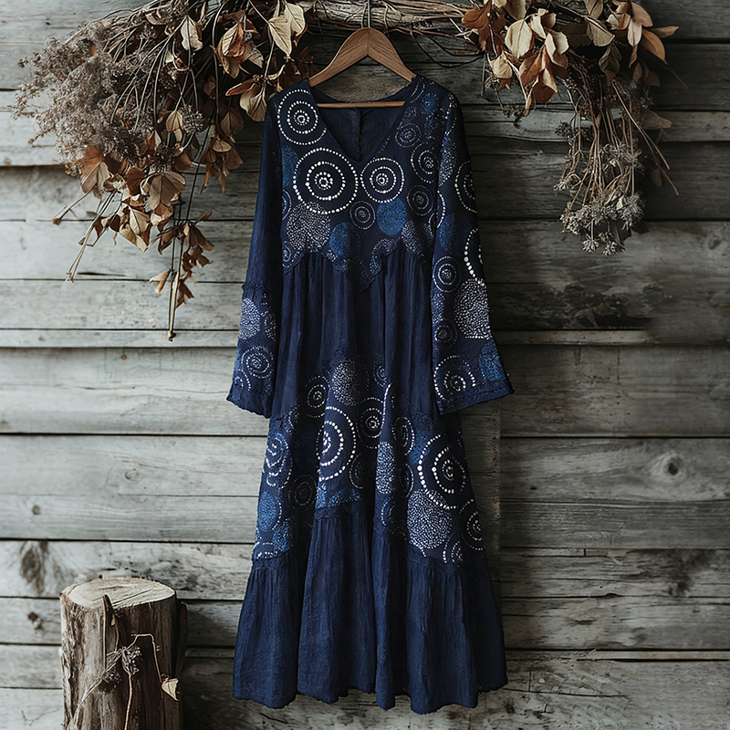 Vintage Japanese Traditional Sashiko Art Pattern Linen Blend Maxi Dress